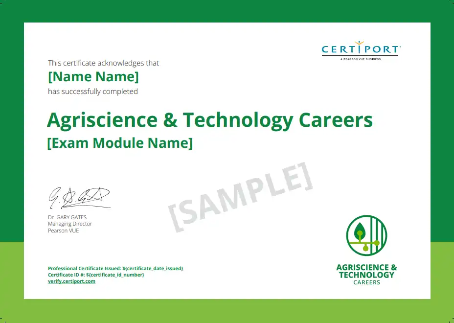 The Agriscience Foundations certification validates that a learner has demonstrated essential knowledge and skills required for professional work in agriculture. This credential confirms readiness across agricultural systems, safety practices, documentation, and food safety.